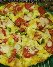 حالا تخم مرغ ها را در کاسه ای شکسته و ادویه بزنید و با چنگال خوب مخلوط نمایید. کف تابه نچسب کمی روغن ریخته، تخم مرغ زده شده را بریزید. روی آن سیب زمینی، سوسیس، فیله های گوجه و فلفل دلمه ای نگینی خرد شده (خام) را بچینید. وقتی همه جا از مواد پر شد، یک تکان آرام دهید که همه سطح را تخم مرغ ها بگیرند (تا بعد سرخ شدن باعث شود مواد به هم بچسبند). بعد روی کل سطح مواد را پنیر پیتزا فراوان بریزید ( من به خاطر دیر هضم بودن و چربی بالای پنیر پیتزا، خیلی کم ریختم ).