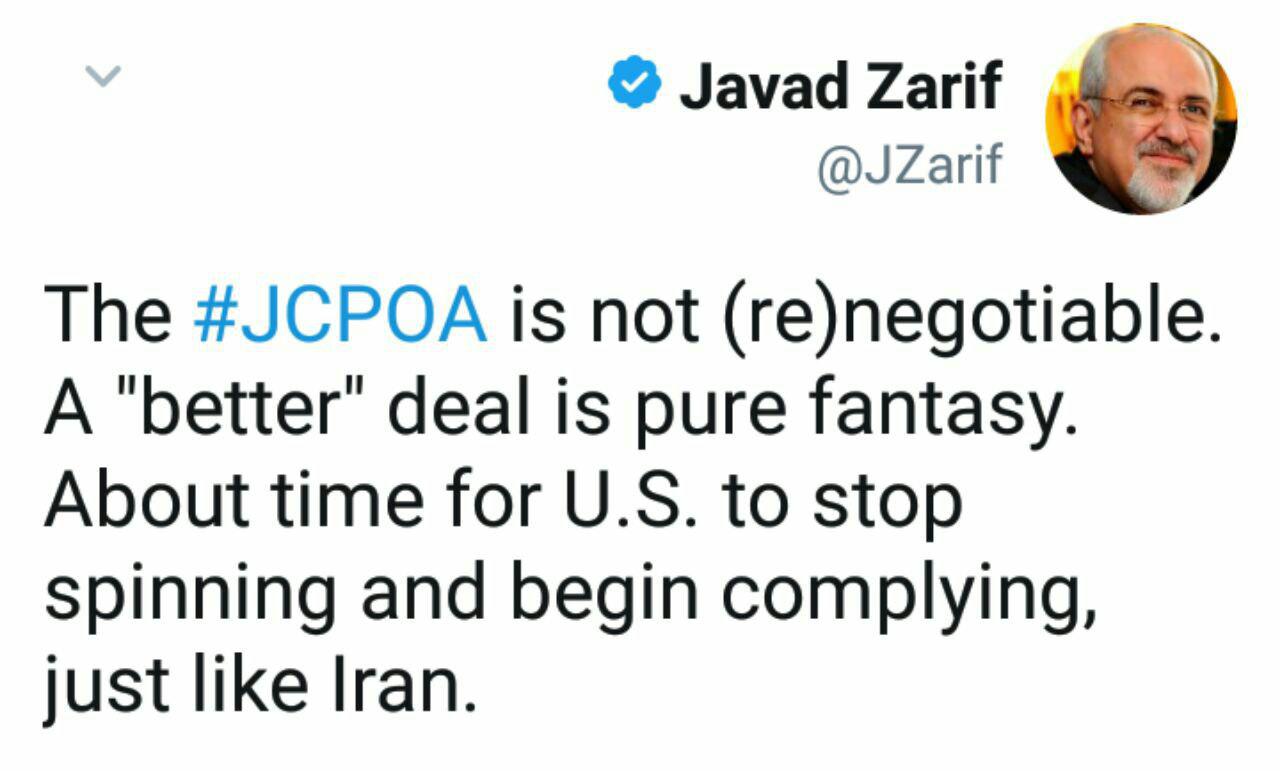 ظریف: برجام قابل مذاکره مجدد نیست. توافق بهتر توهمی بیش نیست. وقت آن است که آمریکا از تحریف واقعیت دست برداشته و شروع به پایبندی به برجام کند، همانطور که ایران پایبند است.