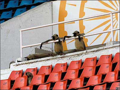 چند ميمون در استاديومی در احمد آباد هند تمرينات يک تيم کريکت را تماشا می کنند