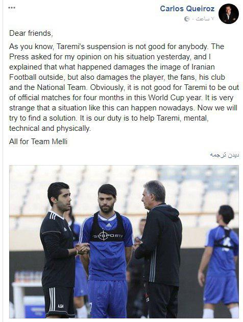به گزارش عصرایران ، کارلوس کی روش در فیس بوک خود بدون اشاره به مسیر مدعی شده تلاش می کند که به مهدی طارمی در مورد محرومیتش کمک کند