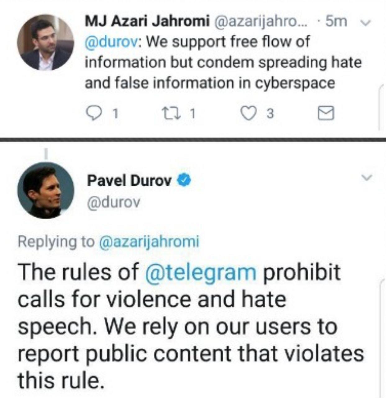 موسس تلگرام در پاسخ به توييت وزير ارتباطات: با تکیه برگزارش کاربران، مصاديق خشونت بار و تنفر برانگيز را متوقف ميكنيم/ آذري جهرمي توييت كرده بود حامی گردش آزاد اطلاعاتیم اما انتشار تنفر ودروغ را محکوم میکنیم