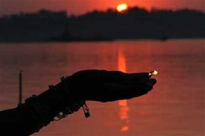 يك زن هندي هنگام غروب آفتاب يك پيه سوز را در كف دستش در حاشيه رودخانه براهماپوترا در منطقه گوهاتي در هند روشن كرده و دعا مي‌خواند.