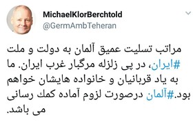 سفیر آلمان در تهران ضمن ابراز همدردی با زلزله‌ زدگان غرب کشورمان از آمادگی آلمان برای کمک رسانی خبر داد.