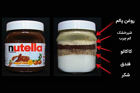 در واقع ۵۵ درصد نوتلا شکر است و روغن گیاهی موجود در آن نیز روغن پالم است که نوعی روغن نیمه جامد است.