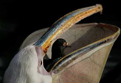 يك پليكان سفيد در حال بلعيدن يك كبوتر سياه در سنت جيمزپارك لندن