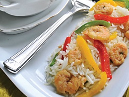 برنج را آبكش كنید. آنگاه در تابه مناسبی، قدری روغن بریزید و پیاز و فلفل دلمهایها را در آن تفت دهید. سپس فیلهی گوجهفرنگی، نمك، فلفل و ادویهی كاری را بیفزائید و با حرارت ملایم بپزید. حالا به میزان كافی آب، در قابلمه بریزید و روی اجاق بجوشانید. میگو، سركه و نمك را درون آب بریزید و به مدت 2 دقیقه بپزید.