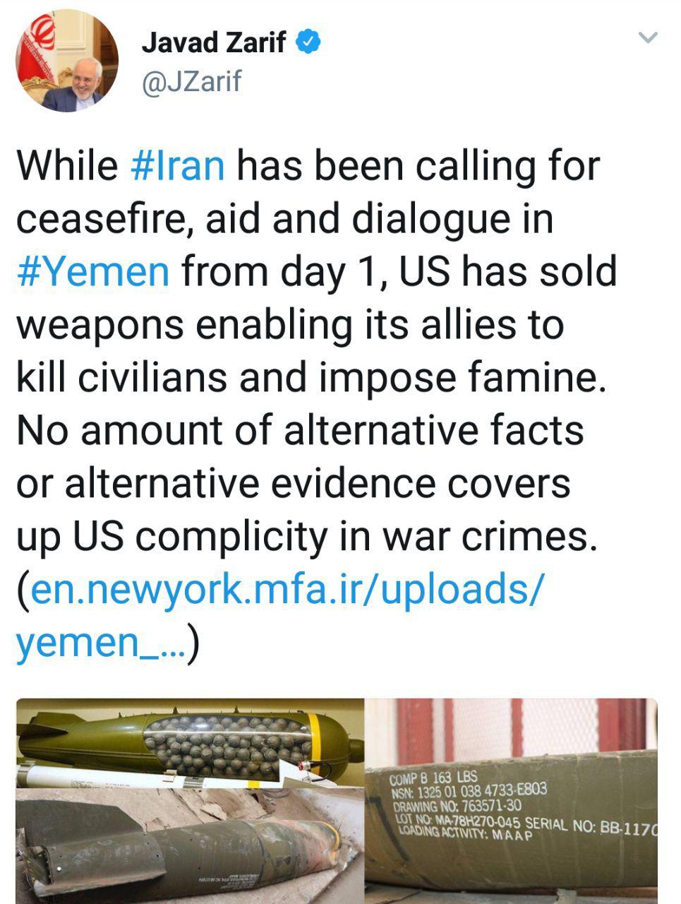 ظریف در خصوص فرافکنی و نقش آمریکاییها در بحران یمن گفت: هیچگونه بازی با حقایق و مستندات (حقایق جایگزین و مستندات جایگزین) هم نمیتواند مباشرت ایالات متحده در جنایات جنگی را بپوشاند.