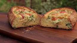 مقداری جعفری تازه،۱ حبه سیر ریز شده،۸ الی ۱۰ عدد گوجه فرنگی دو نیم شده، ۱ قاشق چایخوری آویشن و ۱ قاشق چای خوری پونه کوهی و مقداری پیازچه اضافه کنید و هم بزنید.