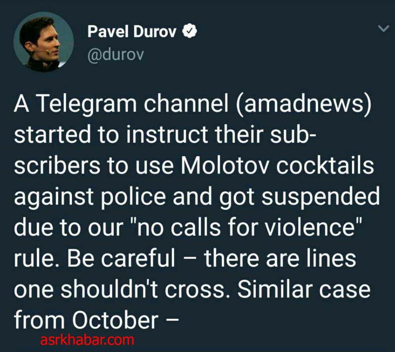 کانال تلگرامی آمدنیوز از دسترس خارج شد کانال تلگرامی آمدنیوز در پی اعتراض وزیر ارتباطات ایران به موسس تلگرام و تاکید بر تحریک این کانال به «نفرت پراکنی» و «تشویق به خشونت» از دسترس خارج شد. پاول دورف مدیر تلگرام: کانال تلگرامی "آمدنیوز" به دلیل تشویق کاربران به خشونت و آموزش ساخت بمب‌های دستی مسدود شد