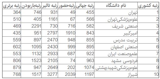 دانشگاه‌های علوم پزشکی تهران، صنعتی شریف، صنعتی امیرکبیر، تربیت مدرس، صنعتی اصفهان، علم و صنعت ایران، فردوسی مشهد، علوم پزشکی شهید بهشتی و شیراز رتبه‌های دوم تا دهم دانشگاه‌های ایران در این رتبه‌بندی را به دست آورده‌اند.