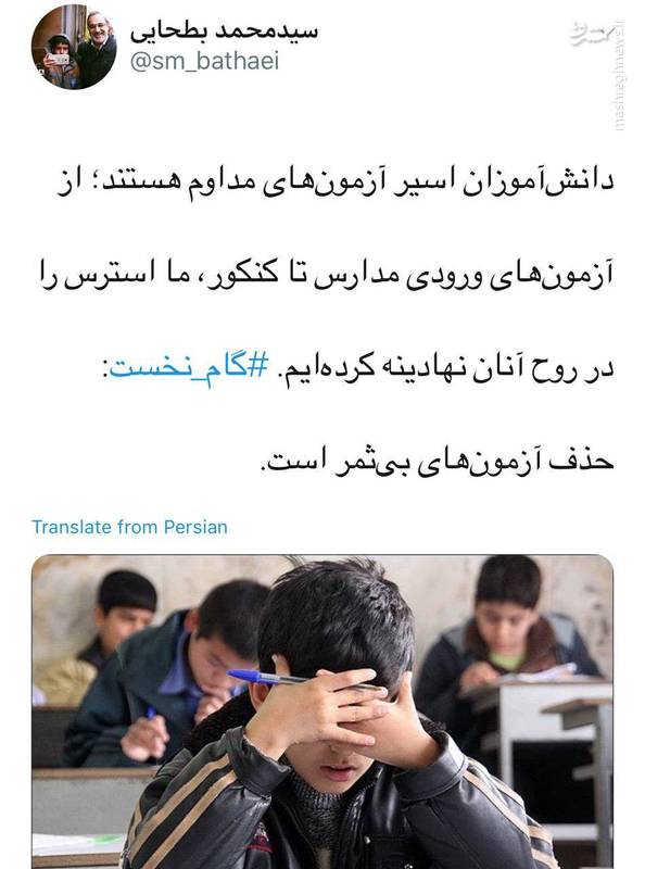 به گزارش ایرنا، سید محمد بطحایی در این پیام یادآورشد: گام نخست : حذف آزمونهای بیثمر در دوره ابتدایی است.