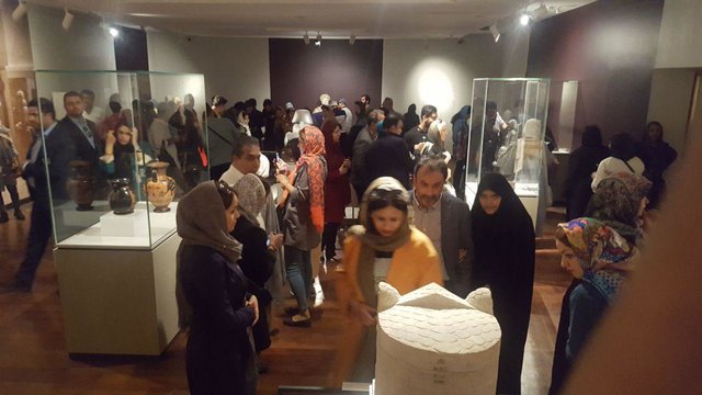 خستگی را میتوان در صورت اعضای خانواده موزه ملی ایران دید. اما برای خوشامدگویی به مردم، لبخند از لبشان محو نمیشود. میتوان گفت انتهای صف تقریبا به نیمه بخش دوران اسلامی در حیاط موزه ملی میرسد، حداکثر نیم ساعت تا رسیدن به اوایل صف طول میکشد. یکی دو دقیقه بعد از وارد شدن یک گروه حداکثر ۱۵ نفری و با خارج شدن تعدادی از گردشگران، گروه جدید بعد از عبور از گیت دوم وارد فضای اصلی تالار دوران اسلامی میشوند.