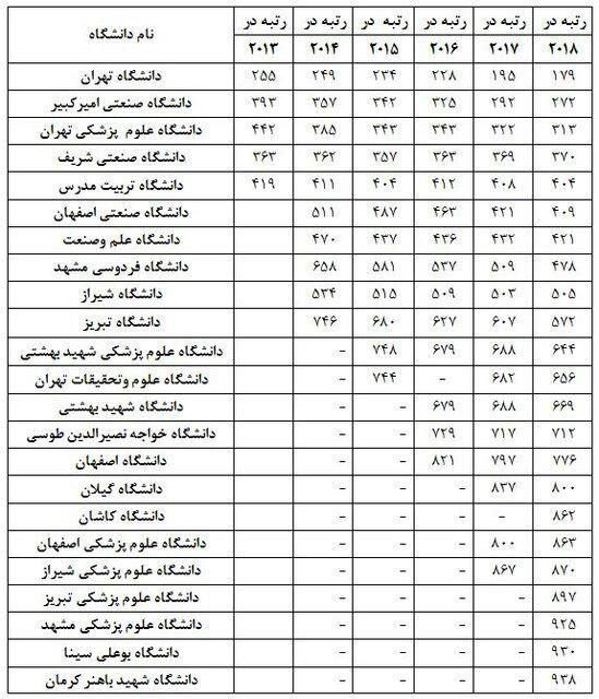 ۲۳ دانشگاه ایرانی در جمع ۹۳۸ دانشگاه‌ برتر دنیا؛ در سال ۲۰۱۷ این تعداد برابر با ۱۸ دانشگاه بود