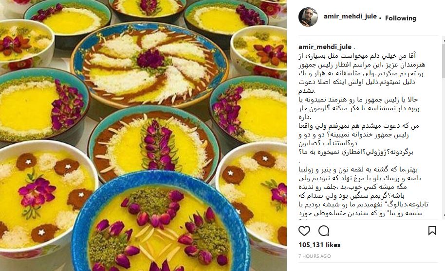 امیر مهدی ژوله که به افطاری رئیس جمهور دعوت نشده است در جدیدترین پست اینستاگرامش نوشت: