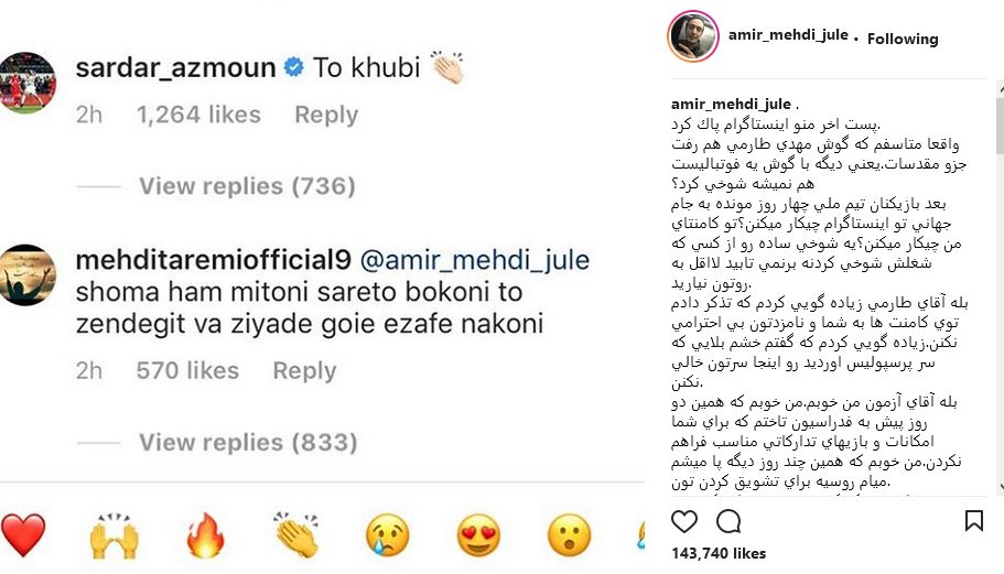 امیر مهدی ژوله با انتشار پستی در اینستاگرامش به کامنت های مهدی طارمی و سردار آزمون جواب داد.