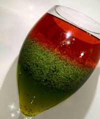 لایه دوم: 3 تا قاشق سوپخوری پر تخم شربتی و آب و کمی رنگ خوراکی سبز
