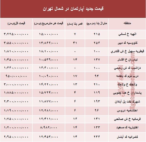 قیمت آپارتمان‌های شمال تهران (جدول)