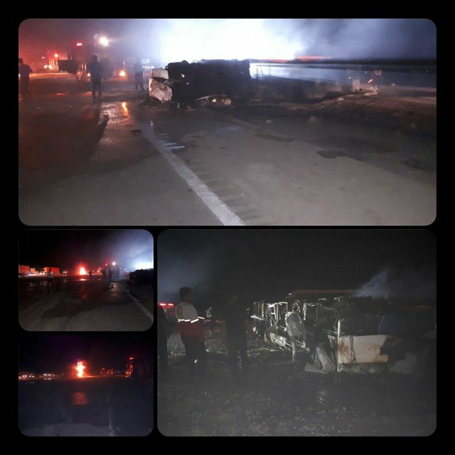 به گزارش ایسنا، شب گذشته بر اثر برخورد اتوبوس مسافری تهران به مقصد کرمان با یک دستگاه تریلر حاوی سوخت در محدوده بادرود در آزاده راه نطنز به کاشان متأسفانه 19 نفر در دم جان باخته و 27 نفر مصدوم شدهاند.
