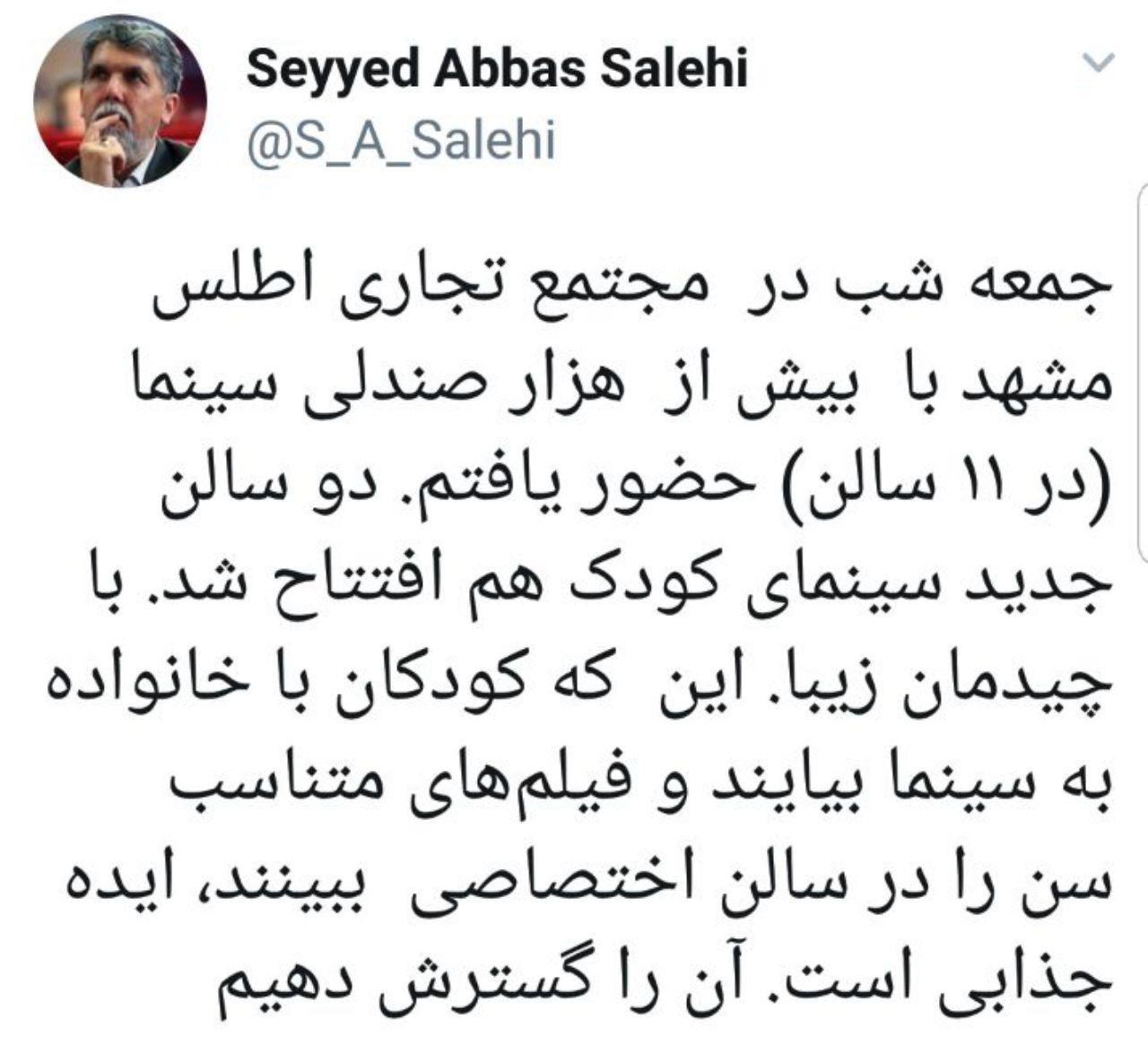 وزیر فرهنگ و ارشاد اسلامی در حاشیه حضورش در افتتاح اولین سینمای کودک کشور در توییترش نوشت:« جمعه شب در مجتمع تجاری اطلس مشهد حضور یافتم. دو سالن جدید سینمای کودک هم افتتاح شد. این که کودکان با خانواده به سینما بیایند و فیلمهای متناسب سن را در سالن اختصاصی ببینند، ایده جذابی است. آن را گسترش دهیم.»