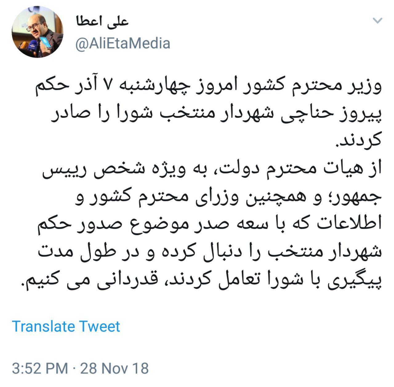 سخنگوی شورای شهر تهران از صدور حکم شهردار تهران ( پیروز حناچی) خبر داد.