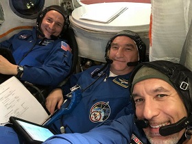 ناو سایوز ام اس-15 در 3 اکتبر 2019 به فرماندهی الگ اسکرپوچکا کیهاننورد با سابقه روسیه راهی مدار زمین میشود. در این ماموریت کریستوفر کسیدی فضانورد ناسا به عنوان مهندس پرواز و هزا المنصور کیهانگر اماراتی وی را همراهی میکنند. سفر اسکرپوچکا و کسیدی تا ماه آوریل 2020 ادامه دارد اما هزا المنصور همراه با کخ و هیگ بر عرشه ناو سایوز ام اس-12 در 18 اکتبر به زمین بر میگردد.