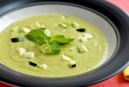 قابلمه را از روی اجاق بردارید. نعنا و گشنیز را اضافه کنید. با یک همزن برقی یا داخل مخلوط کن سوپ را به حالت پوره دربیاورید تا وقتی که کاملاً صاف شوند.