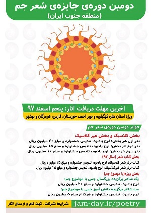 فراخوان دومين دورهی جایزهی شعر جم در منطقه ی جنوب ایران ویژه استان هاي کهگیلویه و بویر احمد، خوزستان،فارس،هرمزگان و بوشهر منتشر شد.