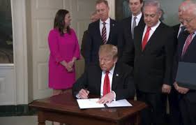 رئیس جمهوری آمریکا در اقدامی خلاف مقررات بین المللی و نقض صریح قطعنامه شورای امنیت، حکمی را امضا کرد که به موجب آن، ایالات متحده حاکمیت رژیم صهیونیستی را بر بلندی های اشغالی جولان به رسمیت می شناسد.