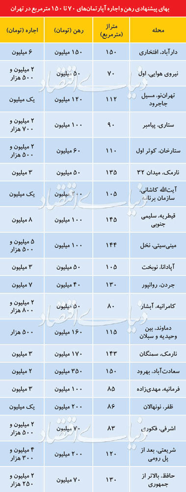 قیمت رهن و اجاره آپارتمان‌های 70 تا 150 متری در نقاط مختلف تهران
