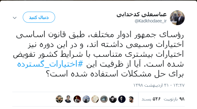 به گزارش عصرایران، در واکنش به سخنان روز سه شنبه رئیس جمهوری درباره نیاز دولت به اختیارات ویژه، عباسعلی کدخدایی سخنگوی شورای نگهبان گفت: "رؤسای جمهور ادوار مختلف، طبق قانون اساسی اختیارات وسیعی داشته اند، و در این دوره نیز اختیارات بیشتری متناسب با شرایط کشور تفویض شده است. آیا از ظرفیت این #اختیارات_گسترده برای حل مشکلات استفاده شده است؟"