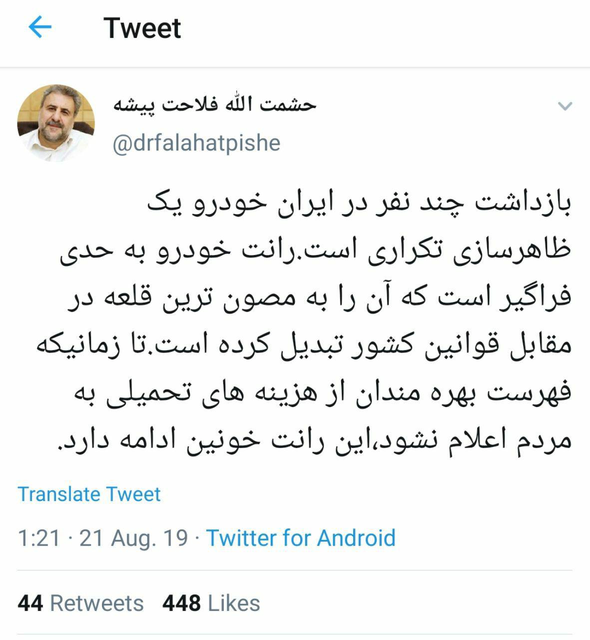 به گزارش ایسنا حشمت الله فلاحت پیشه در مطلبی در صفحه شخصی خود در توییتر نوشت: «بازداشت چند نفر در ایران خودرو یک ظاهرسازی تکراری است. رانت خودرو به حدی فراگیر است که آن را به مصونترین قلعه در مقابل قوانین کشور تبدیل کرده است. تا زمانی که فهرست بهرهمندان از هزینههای تحمیلی به مردم اعلام نشود، این رانت خونین ادامه دارد.»