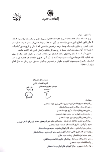 همچنین در ادامه آمده است : تا زمان راهاندازی سامانه استعلام طرح دعاوی کیفری و حقوقی علیه چک از سوی قوه قضاییه، بانک مربوطه می بایست نسبت به مکاتبه با مرکز آمار و فناوری اطلاعات قوه قضاییه برای اخذ استعلام و احراز عدم دعوی کیفری و حقوقی در خصوص چک های مشمول مرور زمان سه سال اقدام کنند.