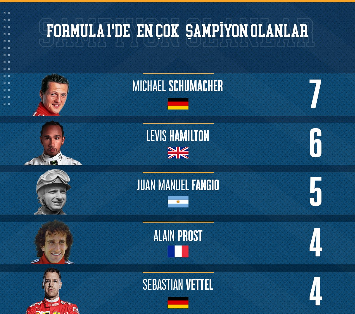 این راننده انگلیس با قهرمانی در فرمول یک قهرمانی جهان در سال 2019 برای ششمین بار یه این عنوان معتبر دست یافت و با روند تنها یک قهرمانی با رکورد اسطوره فرمول یک جهان میشایل شوماخر که با 7 قهرمانی در صدر دیده میشود، فاصله دارد.خوان مانوئل فنگیو سوم، آلن پروست از فرانسه با 4 قهرمانی در مکان چهارم و سباستین فتل آلمانی با 4 قهرمانی پنجم است.