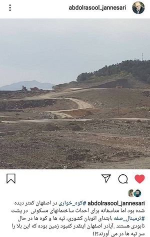 وی در این باره نوشته است: «کوه‌خواری در اصفهان کمتر دیده شده بود اما متاسفانه برای احداث ساختمان‌های مسکونی در پشت ترمینال صفه ابتدای اتوبان کشوری، تپه‌ها و کوه‌ها در حال نابودی هستند. آیا در اصفهان اینقدر کمبود زمین بوده که این بلا را سر تپه‌ها در می‌آورند».