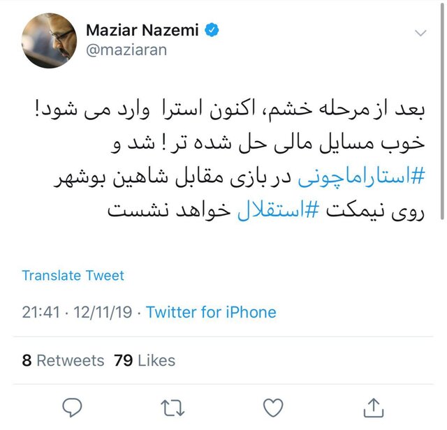 به گزارش ایسنا، مازیار ناظمی، سخنگوی وزارت ورزش و جونان در توییتی ادعا کرد که پس از مرتفع شدن مشکل پرداخت حقوق استراماچونی، این مربی ایتالیایی در بازی روز شنبه مقابل شاهین روی نیمکت استقلال حضور خواهد داشت.