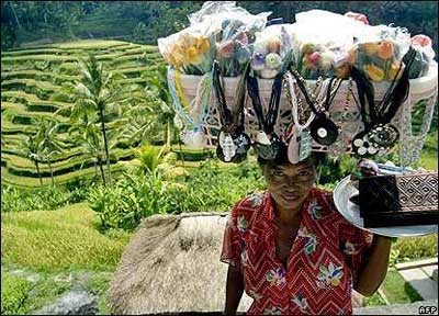 يك زن فروشنده دورهگرد اشيا و وسايل زينتي پلاستيكي در جزيره توريستي بالي در اندونزي