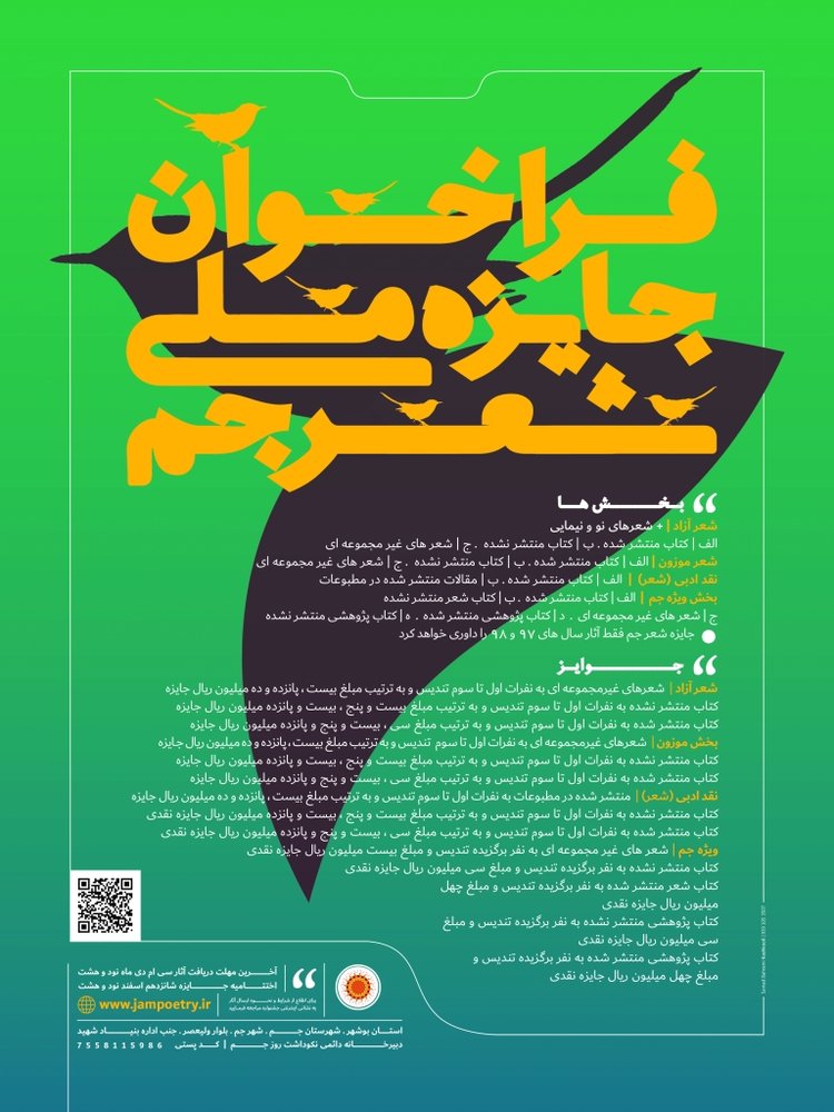 دبیر جایزه ملی شعر جم افزود: علاقمندان به شعر می توانند تا ساعت 24 روز پنج شنبه 10 بهمن ماه با مراجعه به سایت جایزه ملی شعر جم به نشانی http://jampoetry.ir/ نسبت به ثبت نام و ارسال آثار اقدام کنند. (شرایط شرکت در جایزه را اینجا بخوانید)