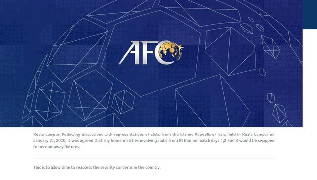 AFc در بیانیه‌ای که به تاریخ 9 بهمن (29 ژانویه) منتشر کرده آورده است: "در جلسه 23 ژانویه با نمایندگان ایران در مقر AFC مقرر شد تا بازی های هفته اول، دوم و سوم مرحله گروهی در خارج از ایران و به عنوان میهمان برگزار شود. این بخاطر داشتن زمان برای بررسی مجدد شرایط امنیتی در کشور است".