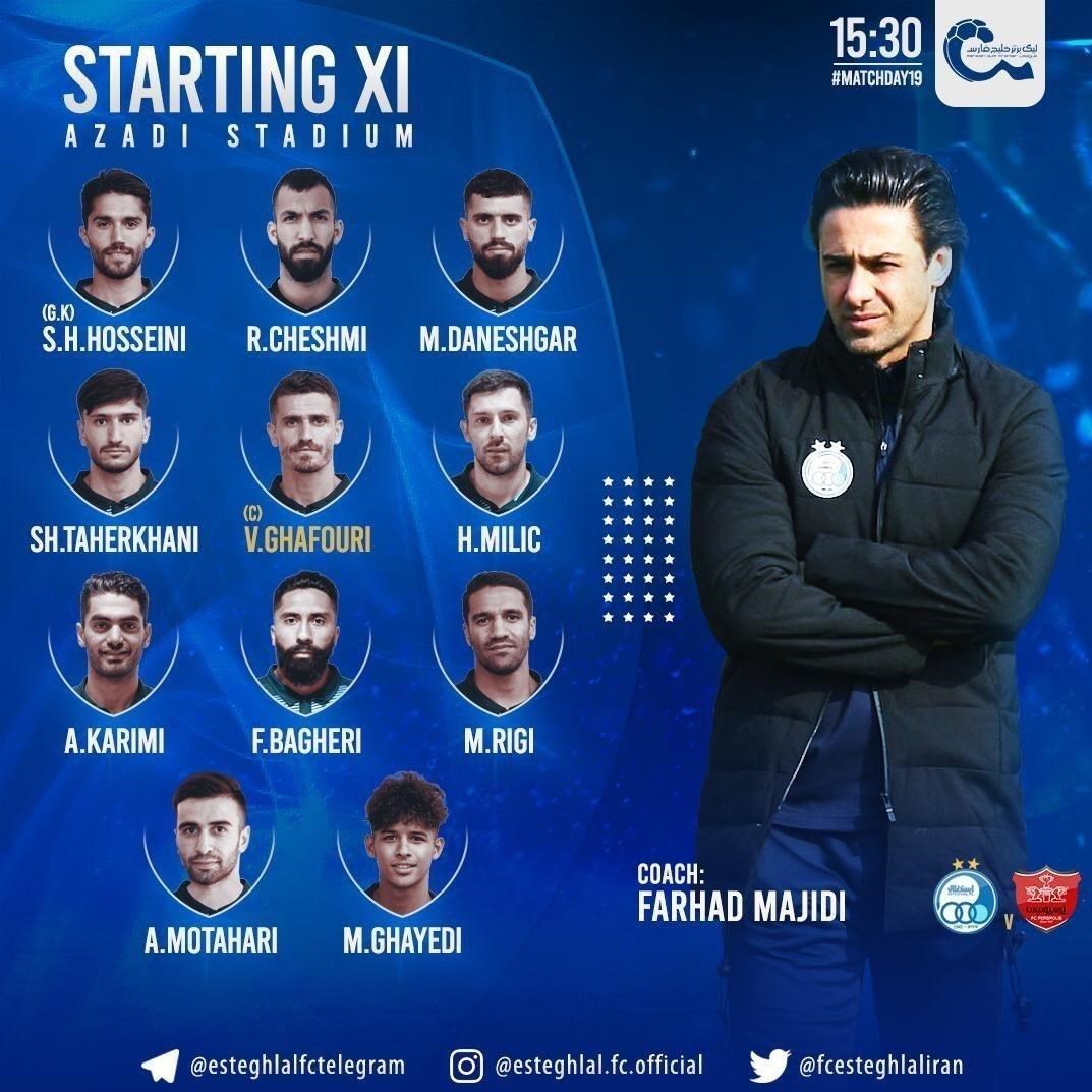 ترکیب تیم فوتبال استقلال برای این دیدار اعلام شد که به این ترتیب سیدحسین حسینی، روزبه چشمی، شاهین طاهرخانی، محمد دانشگر، هروویه میلیچ، وریا غفوری، علی کریمی، مسعود ریگی، فرشید باقری، مهدی قائدی و ارسلان مطهری از ابتدا برای آبیپوشان به میدان میروند.