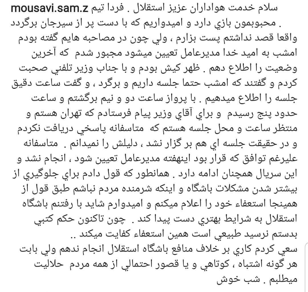 عضو هیات مدیره باشگاه استقلال تهران رسما از سمت خود استعفا داد. به گزارش ایلنا، سید عبدالرضا موسوی عضو هیات مدیره استقلال تهران دقایقی قبل با انتشار پستی در صفحه شخصی خود، رسما از هیات مدیره این باشگاه استعفا داد.