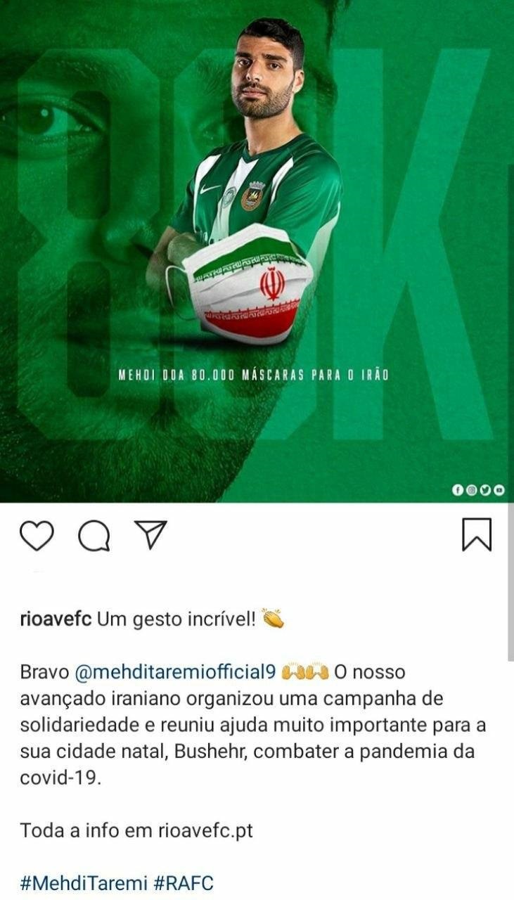 به گزارش ایلنا، مهدی طارمی، مهاجم ایرانی ریو آوه که اصالتی بوشهری دارد یک کارگاه تولید ماسک در این شهر راه اندازی کرد تا به همشهریان خود در مسیر مبارزه با کرونا کمک کرده باشد و این موضوع با تقدیر رسمی باشگاه ریو آوه در صفحه رسمی آن مواجه شد.