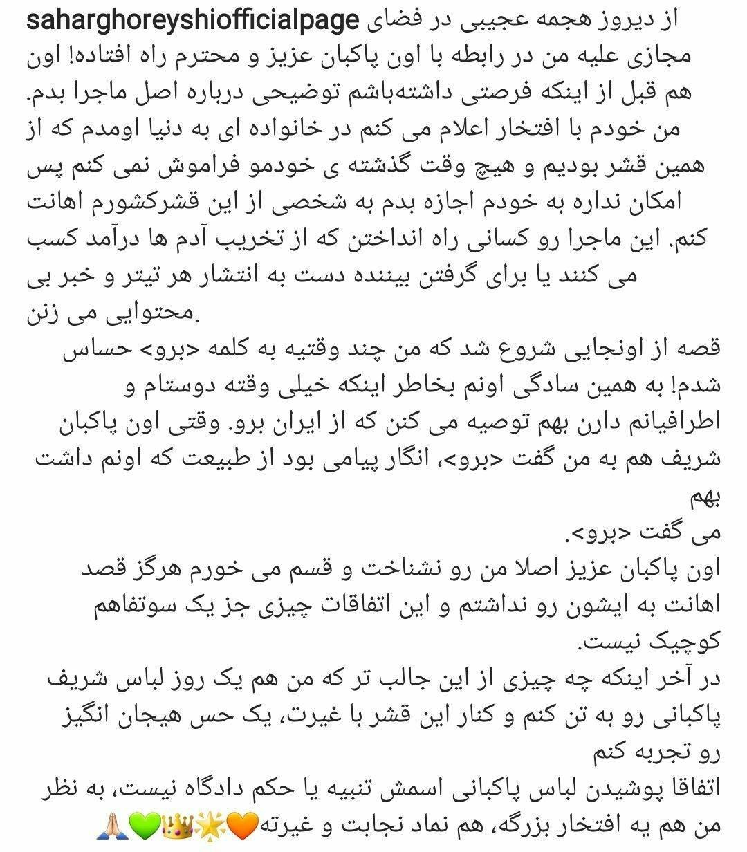 سحر قریشی (بازیگر) در واکنش به انتقادات از برخوردش با یک پاکبان در اینستاگرام نوشت: