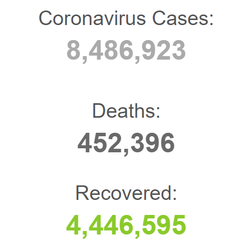 به گزارش خبرگزاری صدا و سیما، به نقل از سازمان جهانی بهداشت تاکنون هشت میلیون و چهارصد و هشتاد و شش هزار و نهصد و بیست و سه نفر در جهان به ویروس کرونا مبتلا شده اند که از این تعداد چهارصد و پنجاه و دو هزار و سیصد و نود و شش نفر جان باخته اند و چهار میلیون و چهارصد و چهل و شش هزار و پانصد و نود و پنج نفر نیز بهبود یافته اند.