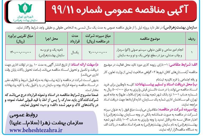 به گزارش عصرایران، براساس آگهی منتشر شده در روزنامه 15 تیرماه 99  کیهان، سازمان بهشت زهرا (بزرگترین قبرستان ایران واقع در جنوب تهران)، مداحی، تلقین متوفی، سیستم صوتی (اکو) سر مزار و چادر، صندلی و میز در سه ناحیه بهشت زهرا را به مبلغ برآوردی 14 میلیارد تومان به مناقصه گذاشته است.
