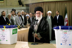 حضرت آیت الله خامنه ای رهبر معظم انقلاب اسلامی در اولین دقایق آغاز رأی گیری دهمین دوره انتخابات ریاست جمهوری و میان دوره ای مجلس خبرگان رهبری با حضور در محل صندوق سیار 110 در حسینیه امام خمینی، آراء خود را به صندوق انداختند.