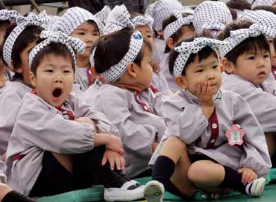 كودكان مهد كودك در انتظار آغاز نمايش سنتي كيك برنج پايان سال