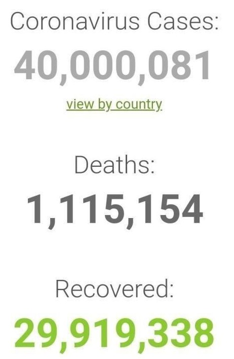 پس از گذشت حدود 8 ماه از پیدایش ویروس کرونا تعداد مبتلایان به این ویروس در جهان از مرز 40 میلیون نفر فراتر رفت. در این مدت حدود 30 میلیون مبتلا بهبود یافته و بیش از یک میلیون و 115 هزار نفر جان خود را از دست دادند.