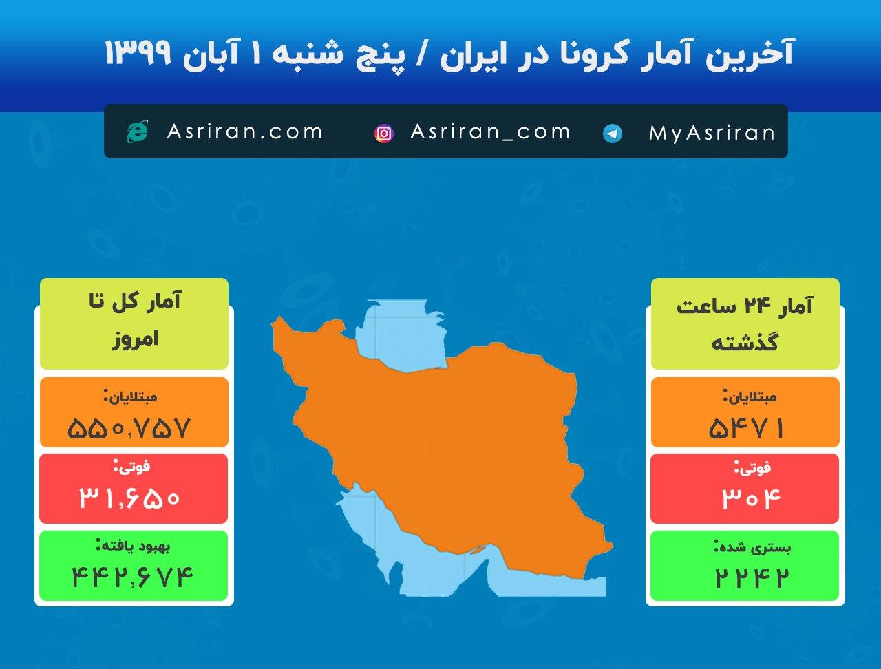 آخرین آمار کرونا در ایران/ پنج شنبه 1 آبان 99 (اینفوگرافیک)