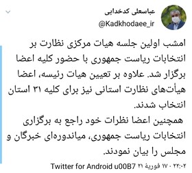 به گزارش ایسنا، عباسعلی کدخدایی در توییتر نوشت:"امشب اولین جلسه هیات مرکزی نظارت بر انتخابات ریاست جمهوری با حضور کلیه اعضا برگزار شد. علاوه بر تعیین هیات رییسه، اعضا هیات های نظارت استانی نیز برای کلیه ۳۱ استان انتخاب شدند.