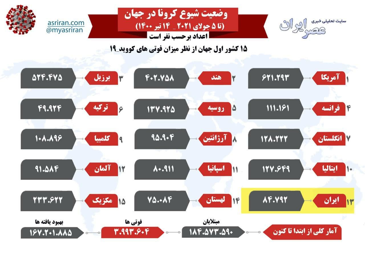 وضعیت شیوع کرونا در جهان دوشنبه ۱۴ تیر (اینفوگرافیک)